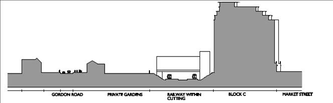 Profile of the proposed Dickens Yard elevation from the west