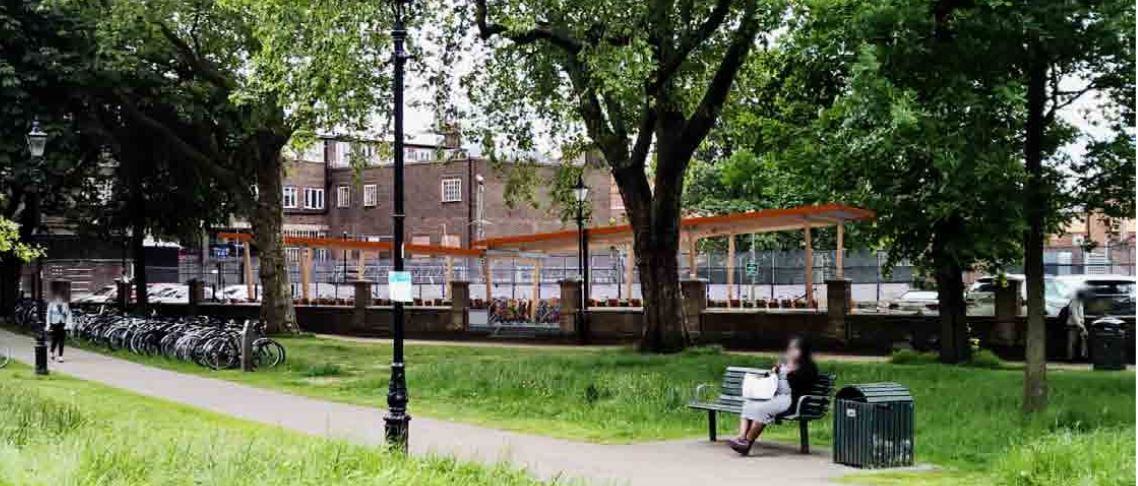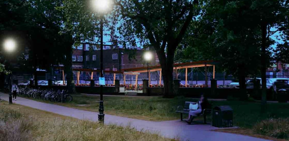 a cycle hub with a steel structure roof and night-time floodlighting in